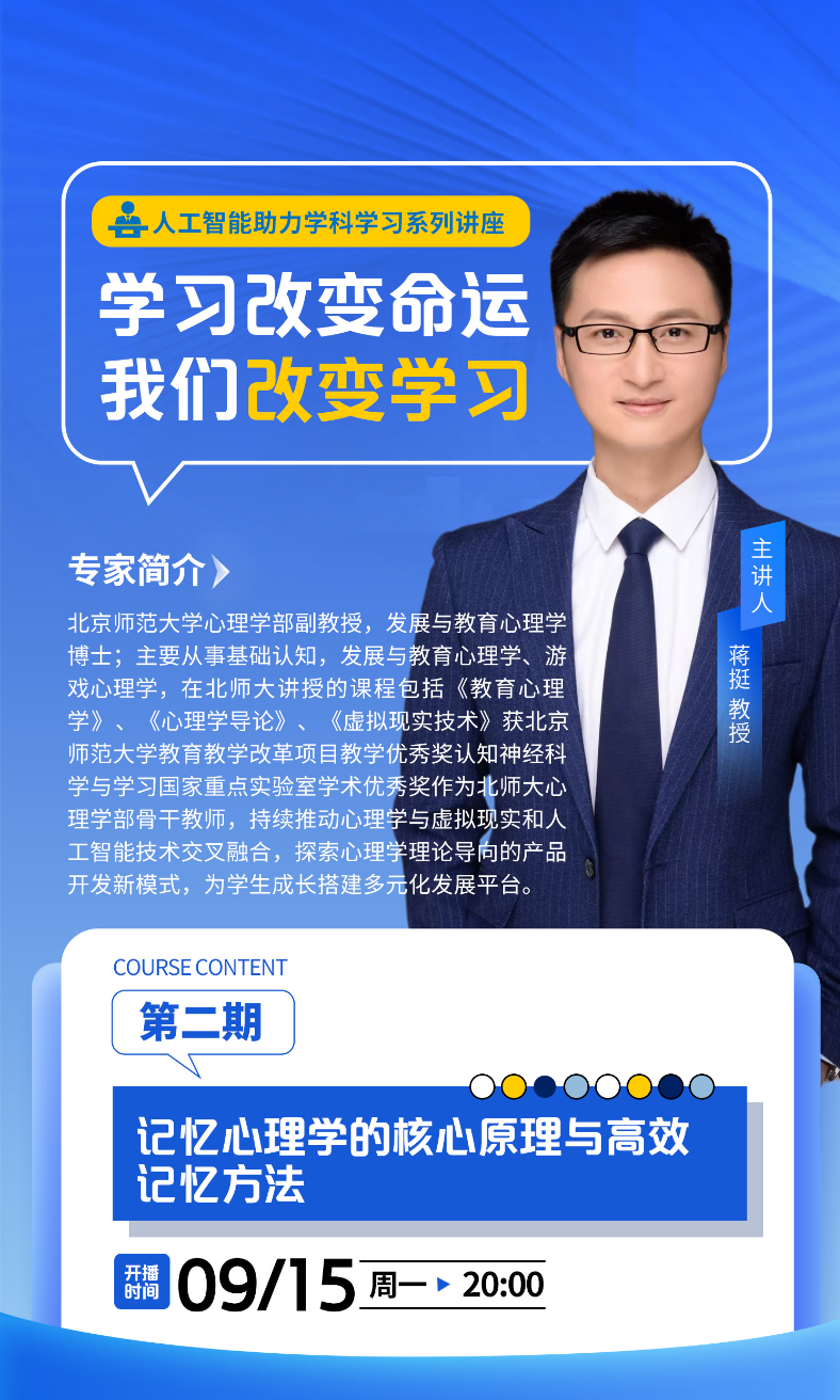 内容:蒋老师为大家分享了记忆心理学的基本原理以及如何实现高级记忆方法,并展示了团队在单词记忆领域的最新研究成果和实践。蒋老师的讲座深受大家欢迎。蒋老师是北京师范大学心理学部副教授,发展与教育心理学博士,主要从事基础认知,发展与教育心理学、游戏心理学,以及人因工程与用户体验等方面的研究。一直致力于在心理学专业领域推广用户体验设计和互联网编程技术,立志于培养心理学领域复合型创新拔尖人才。学术成果丰硕,近期在《Behavior Research Methods》《Psychophysiology》《Psychological Research》等国际权威期刊发表多篇论文,聚焦于基础认知(信息加工模型)、二语学习、和游戏测评及人因安全等前沿课题(以国家需求和社会需求为导向);部分研究成果已成功应用于功能游戏设计与开发实践。